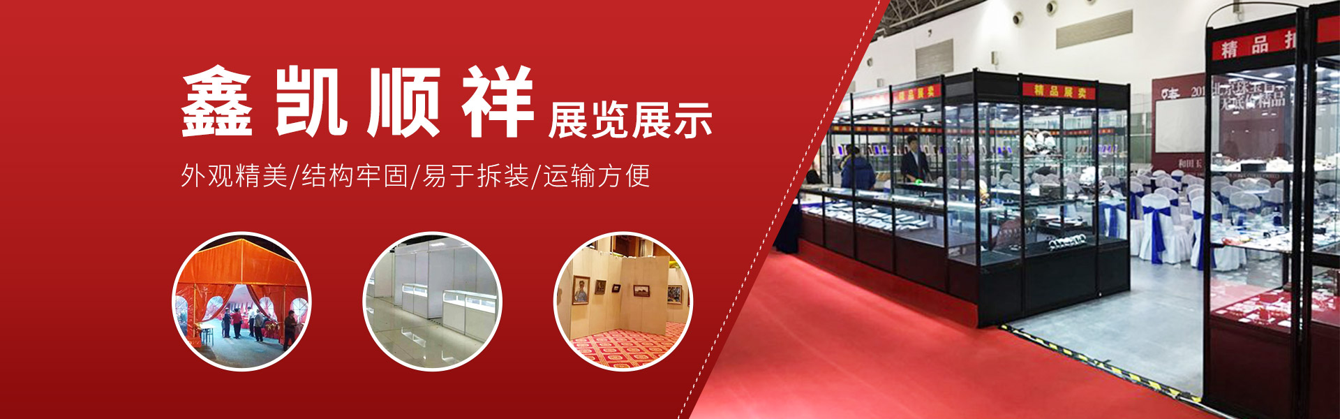 北京鑫凱順祥展覽展示有限公司是鋁合金玻璃展柜、精品展柜、標準展位展板租賃的公司。產品外觀精美,設計合理標準。鋁材表面色澤亮麗、顏色明快、同與之色彩相配的防火面板組合,可讓產品達到更好的展示效果 。此類展柜外觀精美,結構牢固,易于拆裝,運輸方便,廣泛用于展廳、展覽會,拍賣會,招聘會等活動,為廣大客商帶來很好的展示效果。我們自備大量的各類展柜,提供送貨上門地布置服務,使客戶租用過程中,減少流通環節,降低客戶費用,客戶省時、省力、省心。憑著我們的經驗和實力,誠懇和勤奮,以靈活、快捷、周密的運作,為客戶提供了周到、細致的服務,高質量地完成了多個委托會展、拍賣會用品租賃的業務。為滿足廣大客戶的需求,本著為客戶服務的精神,我們為廣大來京參加展會的商家提供標準展柜的租賃業務,也可向外地客戶提供服務。